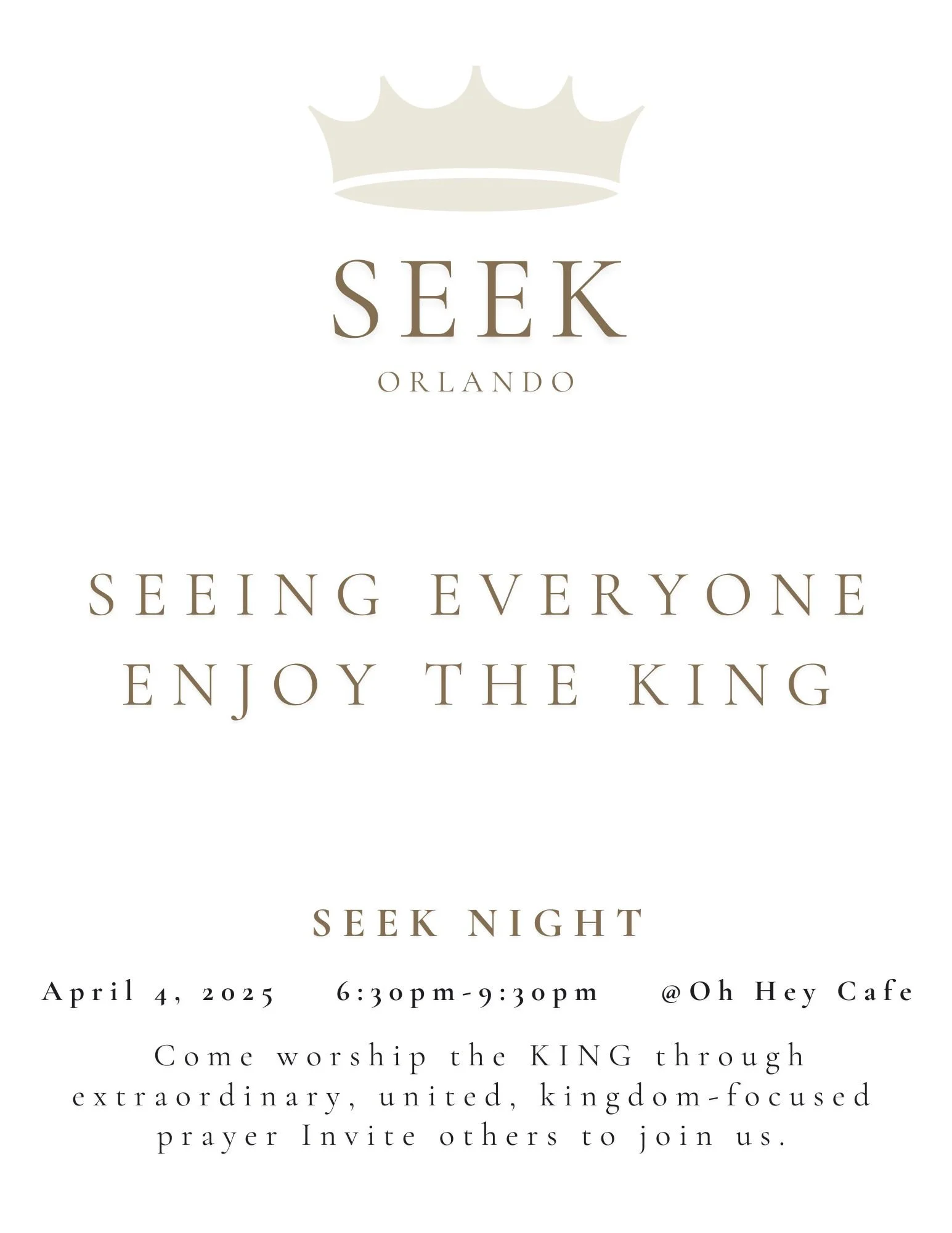 SEEK describes both our vision(to See Everyone Enjoy the King) and our mission(seeking the face of God through extraordinary, united, kingdom-focused prayer). We are a movement of united churches and leaders around Orlando who are hungry to see & experience more of Jesus’s power and presence break into our families, churches, communities, and city. We gather at different times weekly, quarterly, & annually for times of encounter and intercession with worship and prayer.
