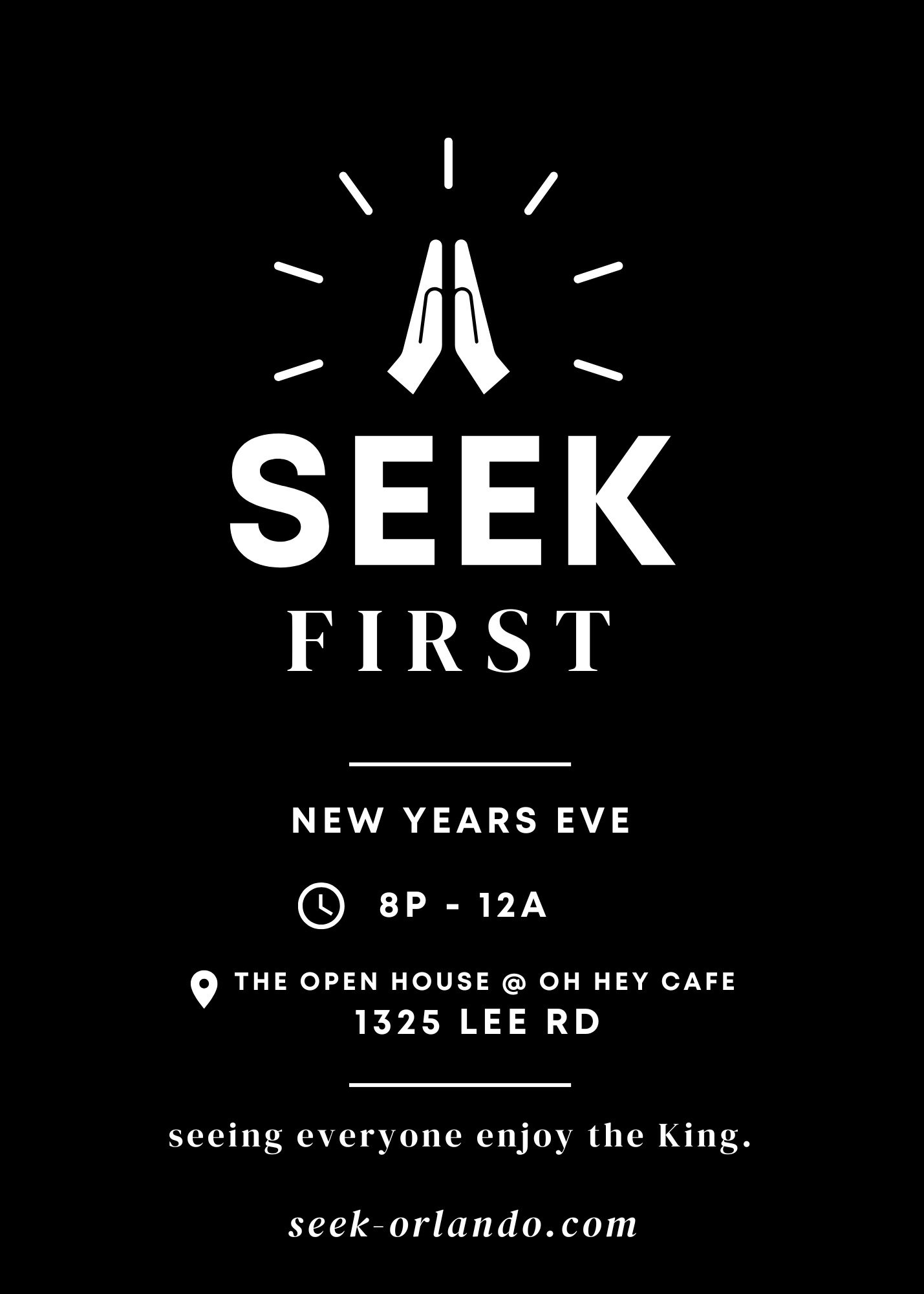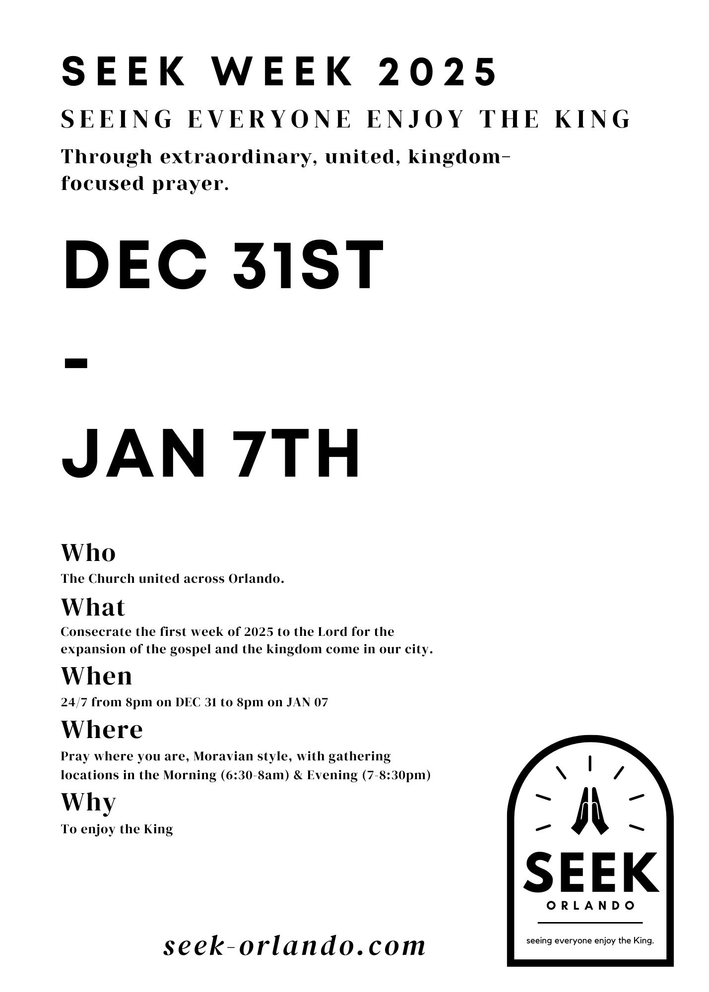 SEEK describes both our vision(to See Everyone Enjoy the King) and our mission(seeking the face of God through extraordinary, united, kingdom-focused prayer). We are a movement of united churches and leaders around Orlando who are hungry to see more of Jesus’s power and presence break into our families, churches, communities, and city. We gather monthly for a time of encounter and intercession with worship and prayer.